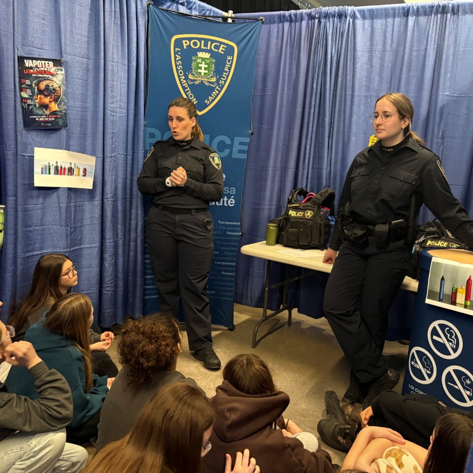 Un peu plus loin, le Service de police de L’Assomption / Saint-Sulpice discute toxicomanie avec les élèves, en tenant compte des tendances actuelles chez les jeunes. « La problématique majeure du moment, c’est tout ce qui est la nicotine en vapoteuse et le wax pen, qui est du cannabis en huile concentrée et ils ne savent pas d’où ça vient », alerte l’agent sociocommunautaire.