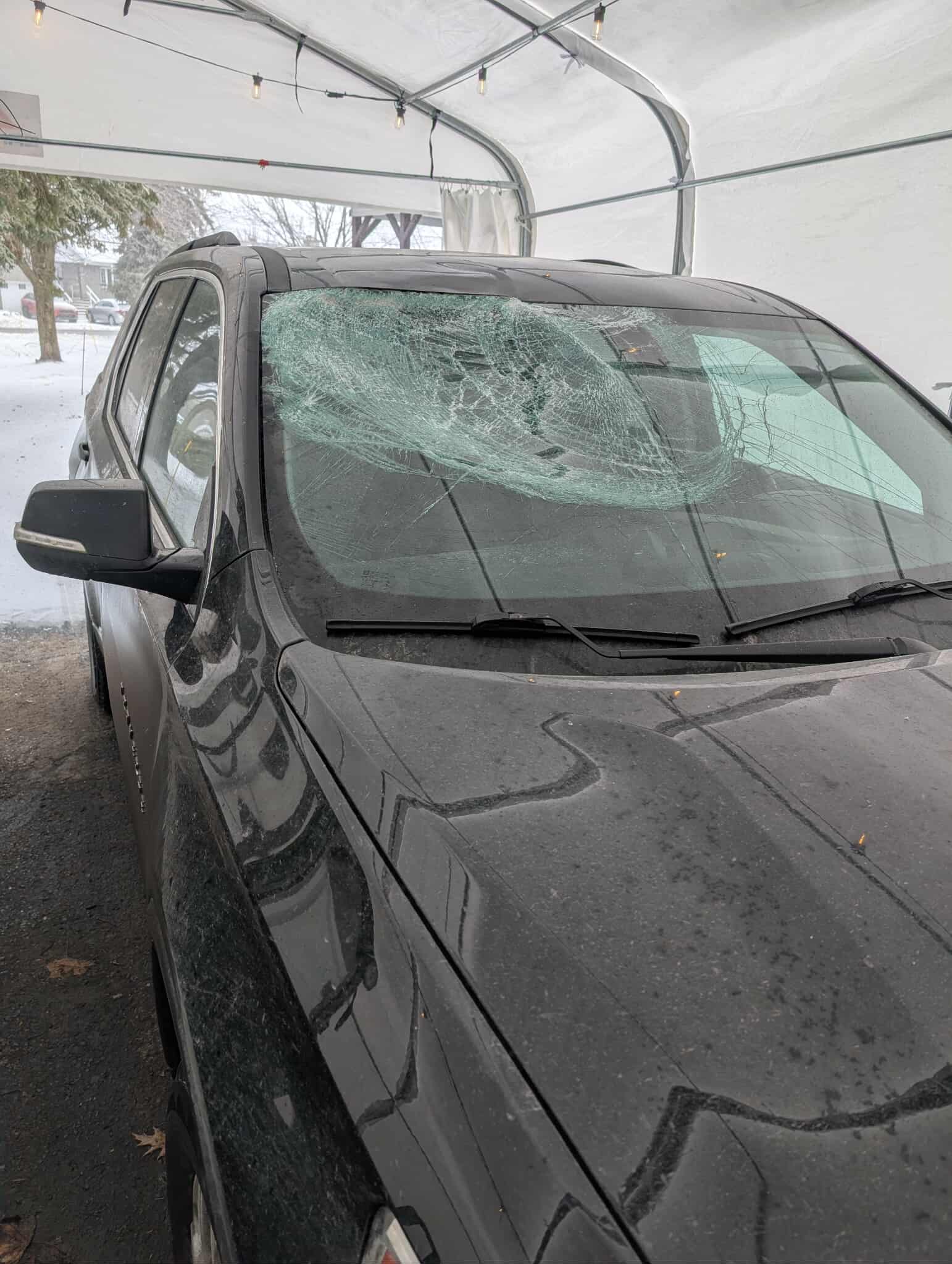 « Quand il y a du verglas ou de la glace collée, ce n’est pas suffisant de déglacer seulement les vitres. Il faut aussi nettoyer le toit, le capot et les côtés du véhicule. À la vitesse sur l’autoroute, un morceau de glace peut devenir très dangereux et causer des accidents ou des dommages importants. C’est juste un pare-brise, mais ça aurait pu être beaucoup plus grave », a écrit Mélanie Gagnon dans une publication partagée sur plusieurs pages « Spotted » du secteur.